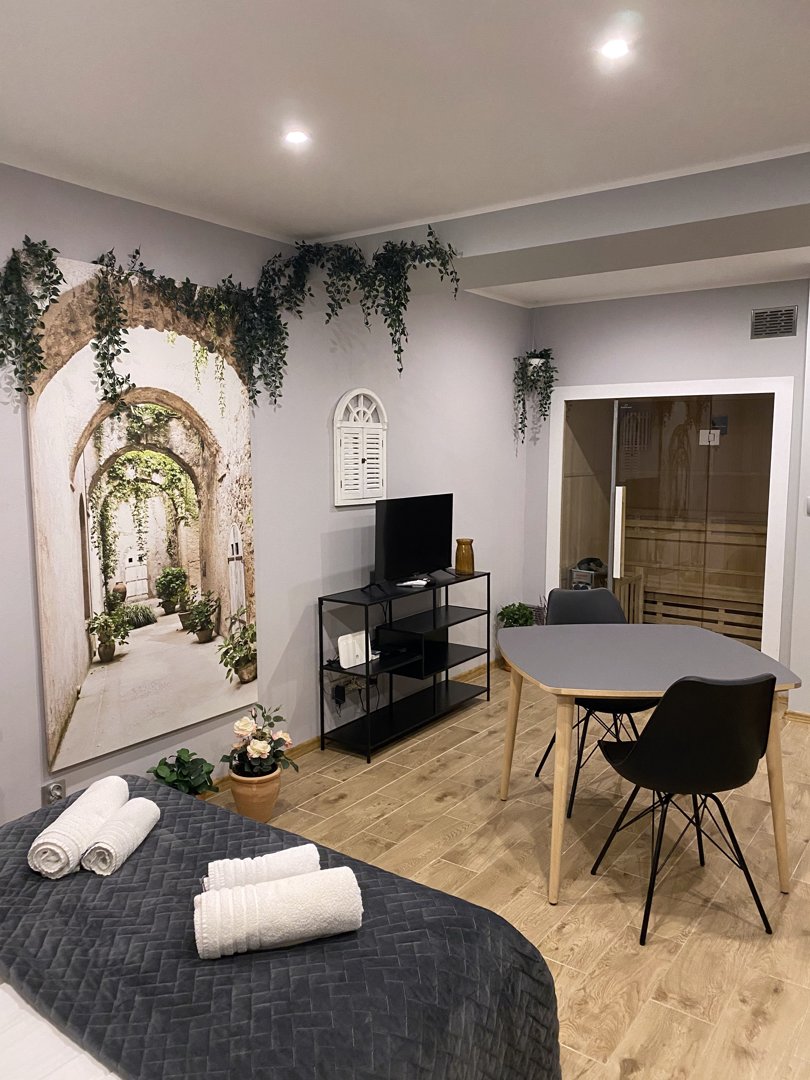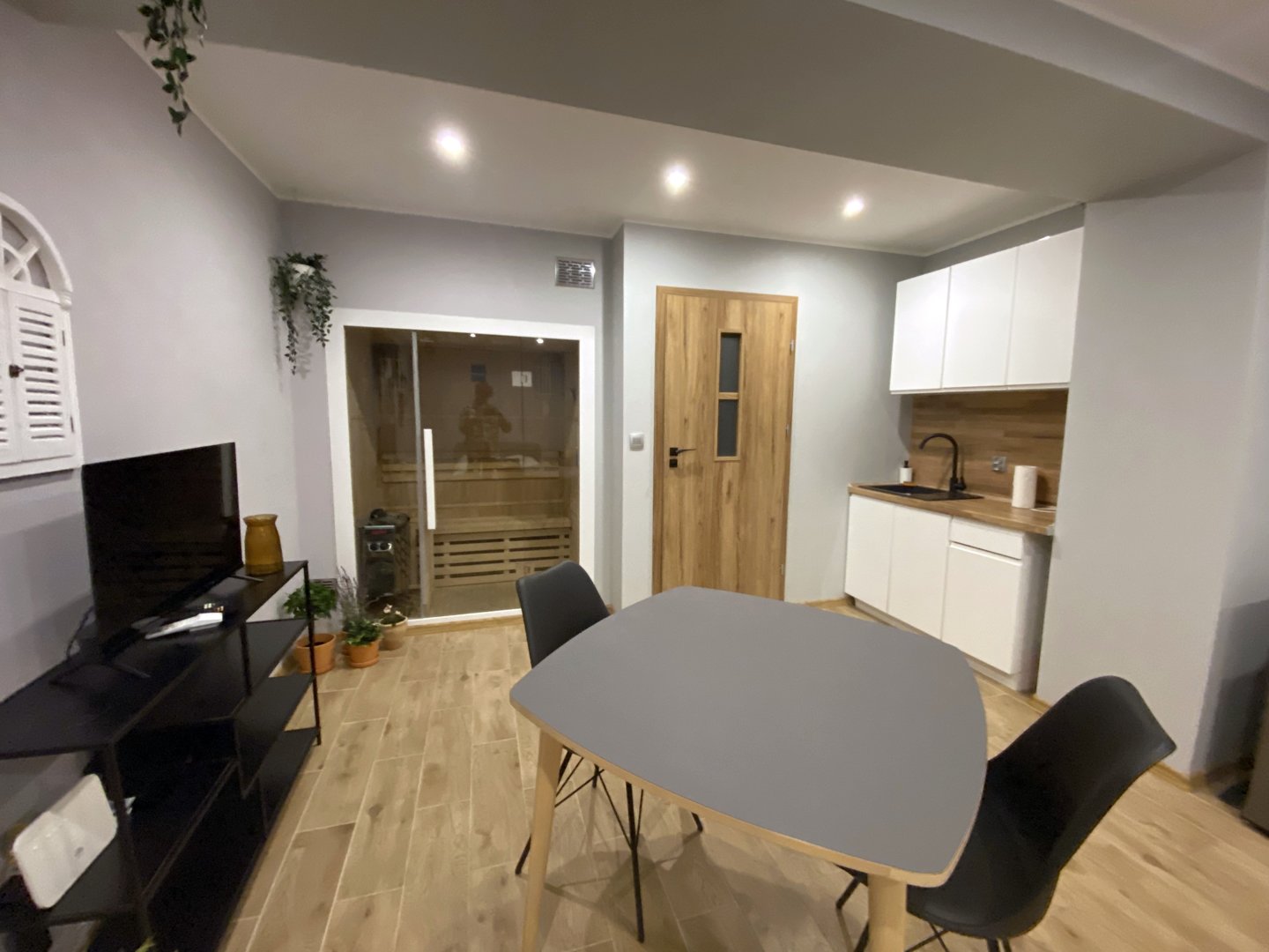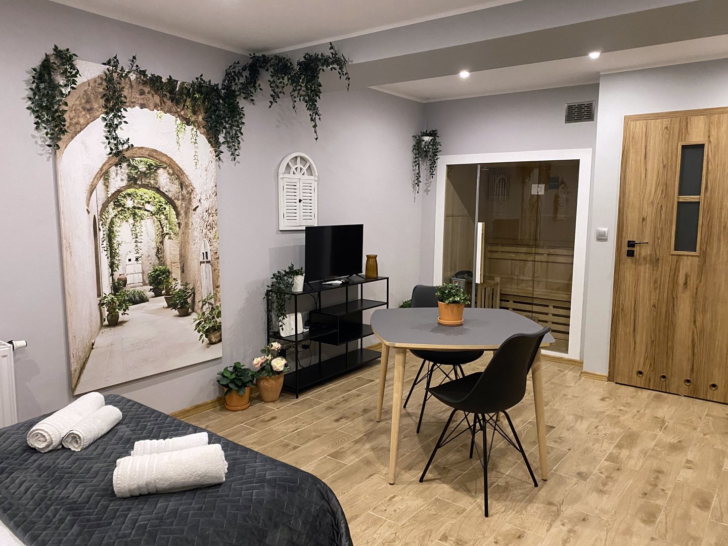 Miodowa Faktoria with a sauna is a compact studio apartment in the heart of Toruń's Old Town. The apartment accommodates 1-2 people and offers a private sauna, kitchenette, and air conditioning. It's a functional solution for guests planning short stays, sightseeing, or business trips. The location allows quick access to major attractions and the Toruń Miasto train station.Miodowa Faktoria with a sauna is a compact studio apartment in the heart of Toruń's Old Town. The apartment accommodates 1-2 people and offers a private sauna, kitchenette, and air conditioning. It's a functional solution for guests planning short stays, sightseeing, or business trips. The location allows quick access to major attractions and the Toruń Miasto train station.