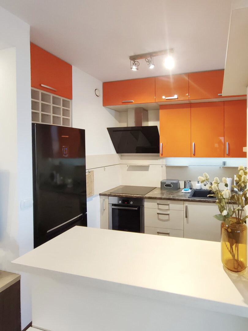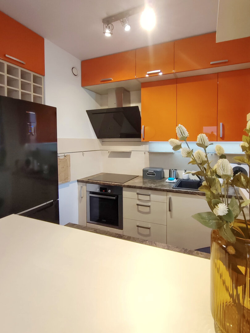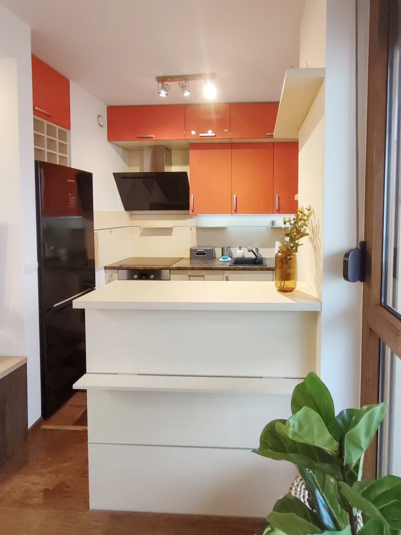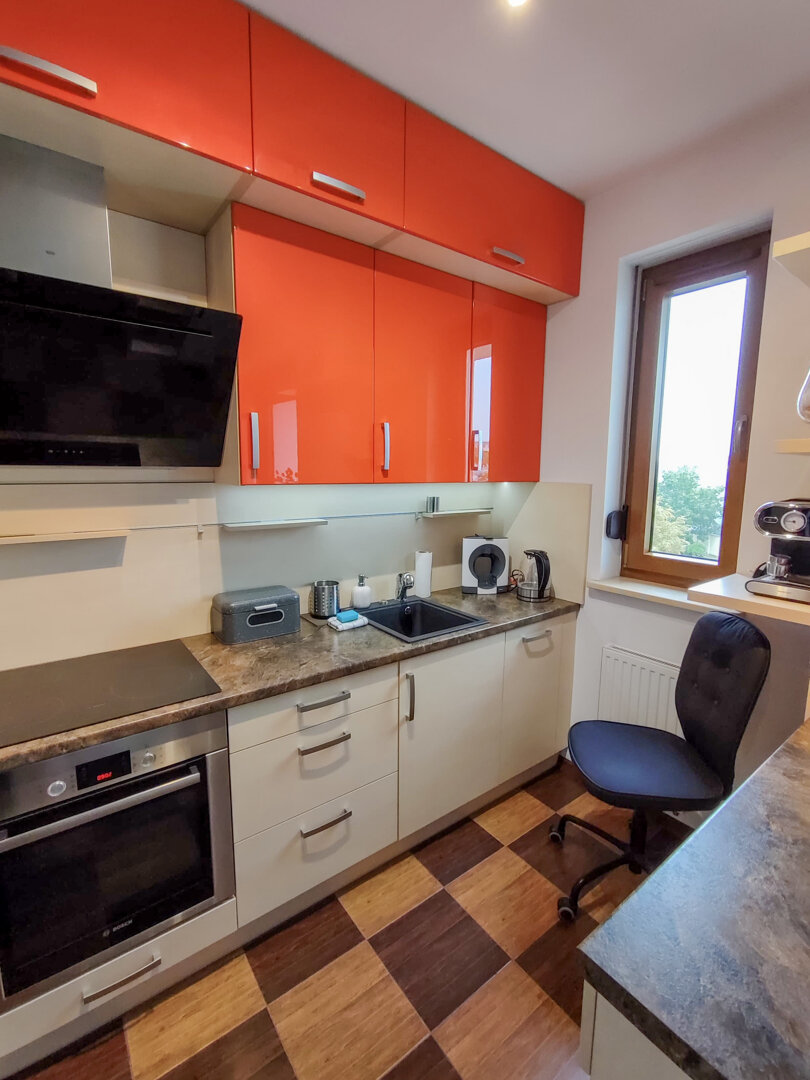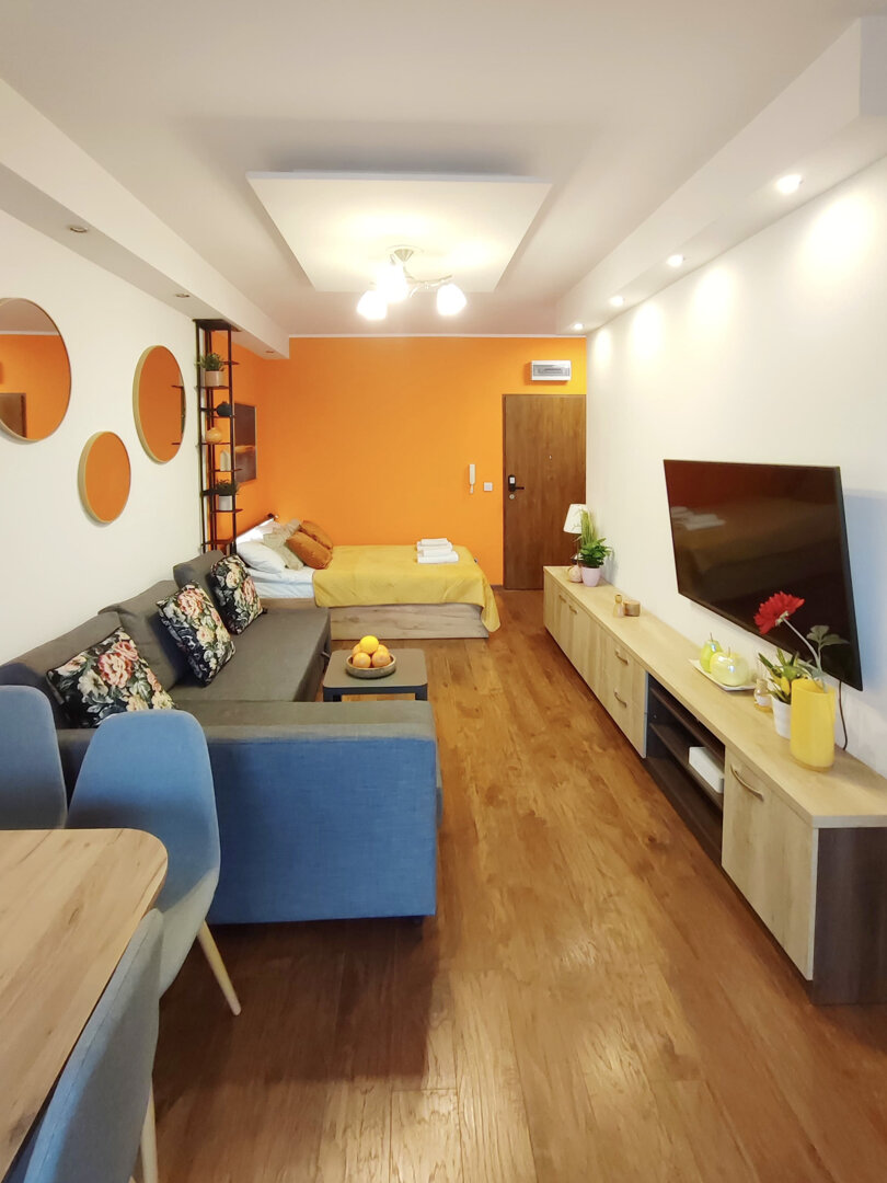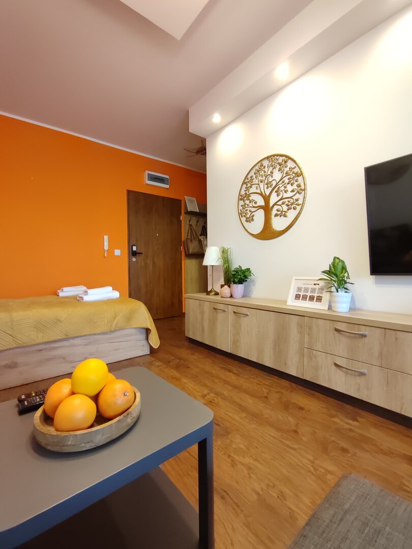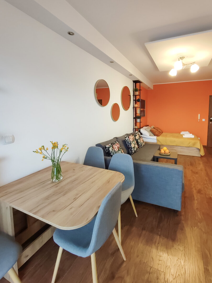 The Sweet Orange Apartment is a fully equipped, modern 31 m² apartment in Toruń, designed for maximum functionality and comfort for a couple or one or two people. Located in a quiet, gated community with private parking, it provides comfort and security for those traveling by car. The interior includes a separate sleeping area with a sofa bed, a fully equipped kitchenette, and a private bathroom with a shower. A balcony overlooking the courtyard provides space for outdoor relaxation. The property offers a standard suitable for long-term stays and short business or leisure visits. Type and Standard