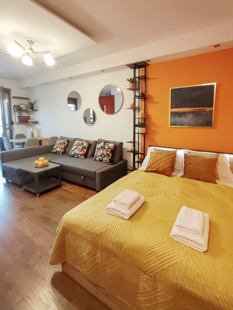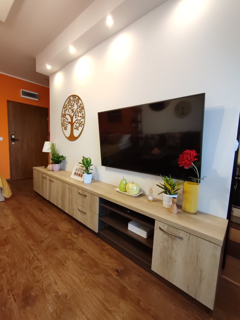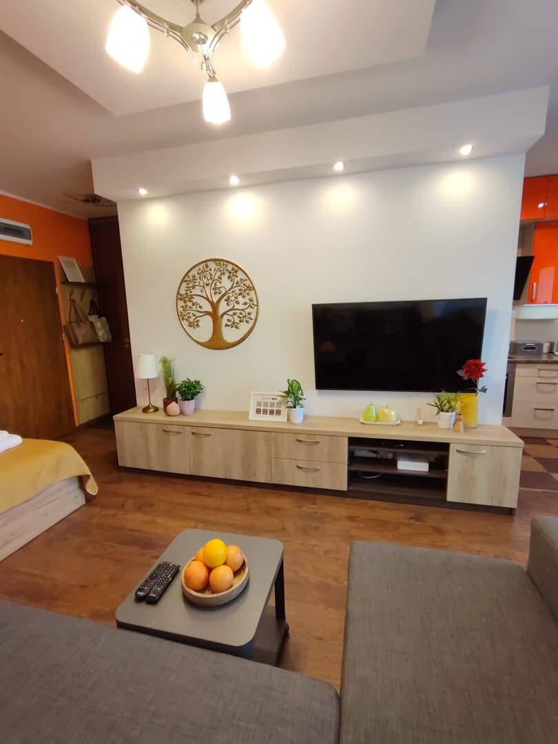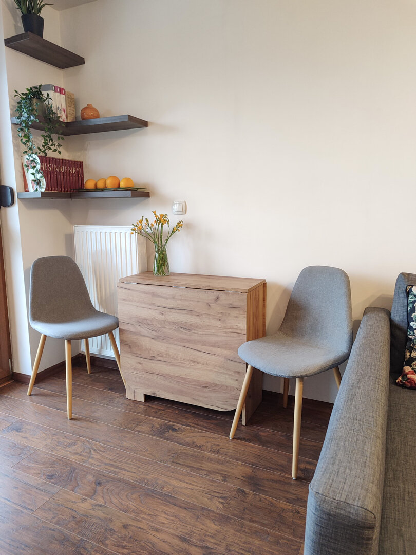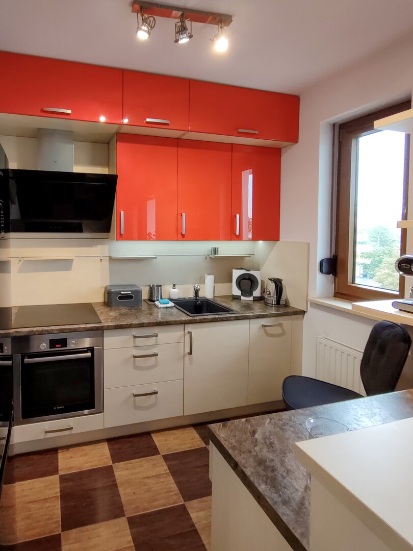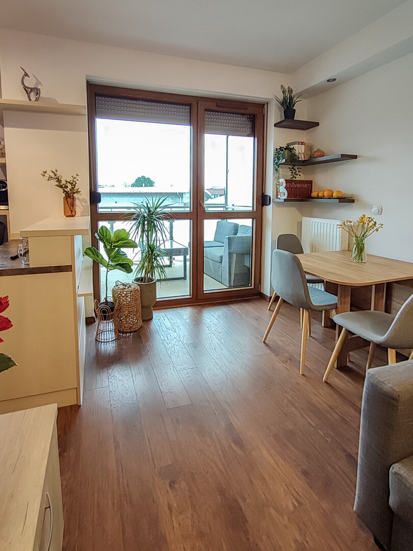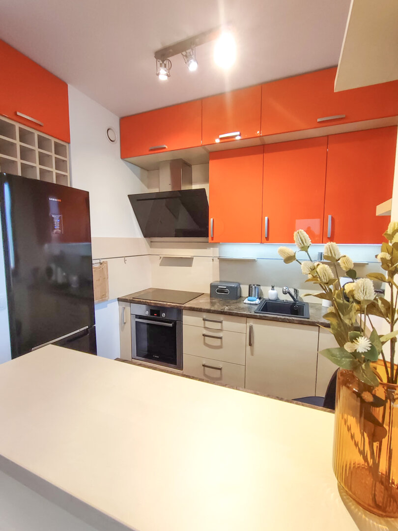 The Sweet Orange Apartment is a fully equipped, modern 31 m² apartment in Toruń, designed for maximum functionality and comfort for a couple or one or two people. Located in a quiet, gated community with private parking, it provides comfort and security for those traveling by car. The interior includes a separate sleeping area with a sofa bed, a fully equipped kitchenette, and a private bathroom with a shower. A balcony overlooking the courtyard provides space for outdoor relaxation. The property offers a standard suitable for long-term stays and short business or leisure visits. Type and Standard