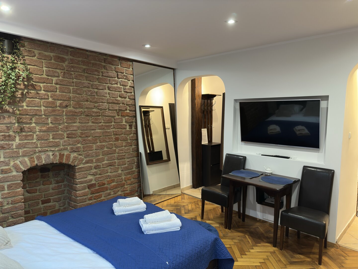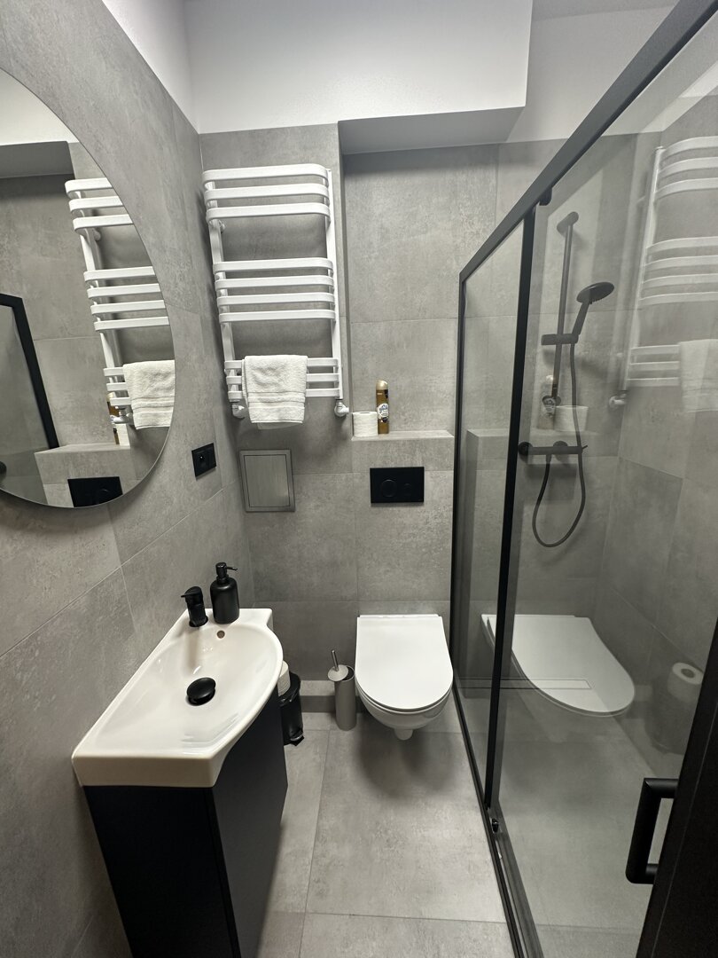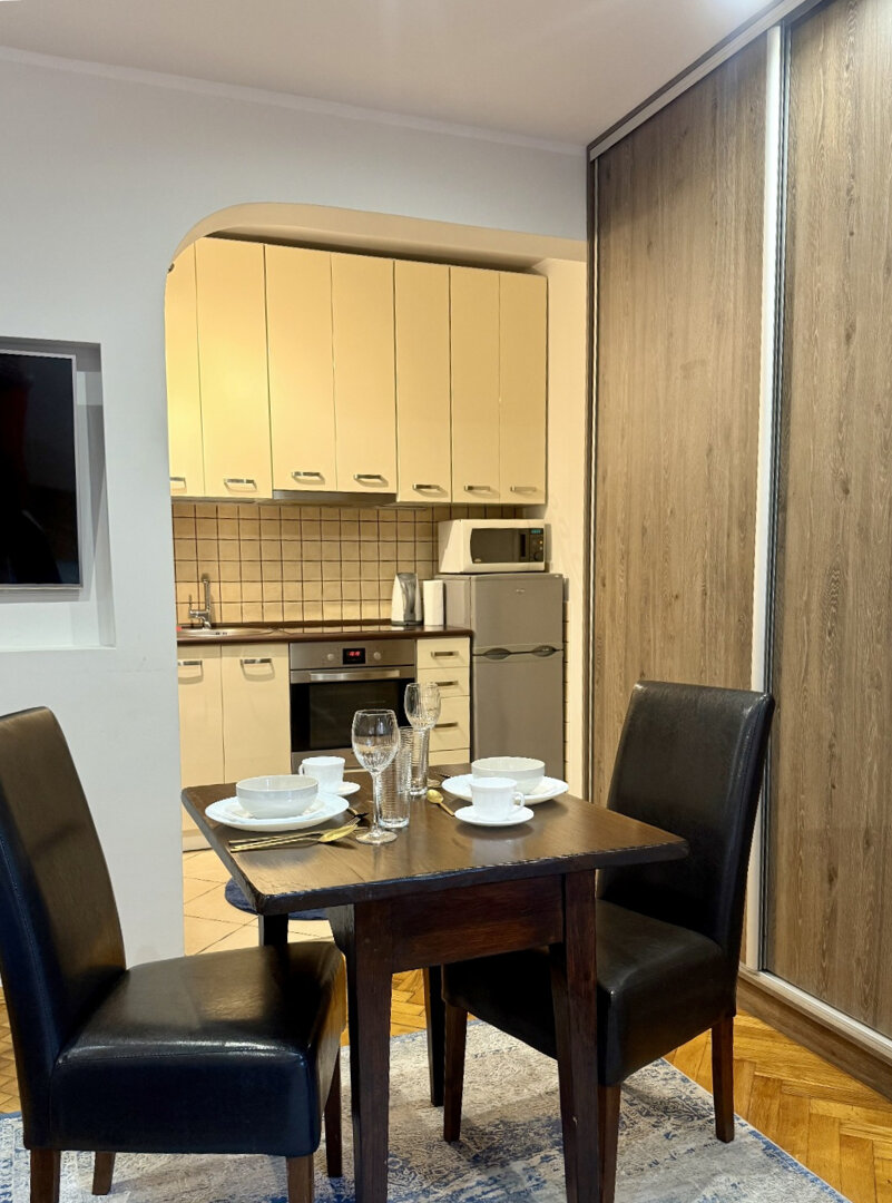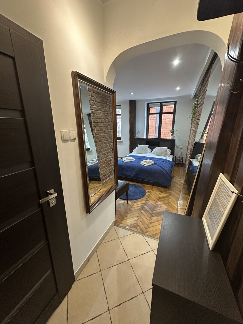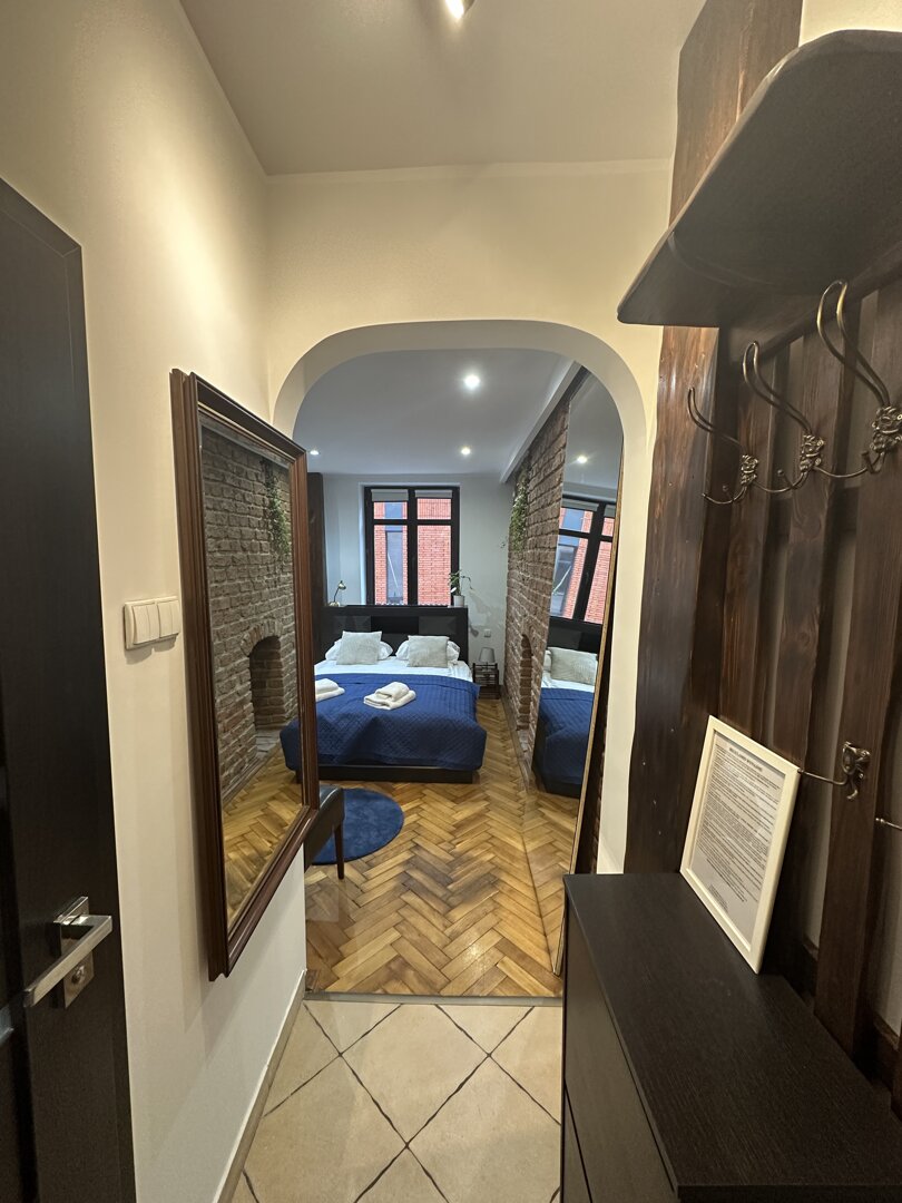 Kitchen-Kitchenette; Refrigerator; hob; oven; microwave; electric kettle; kitchenware and accessories; dining area.Technology-Free Wi-Fi; flat-screen TV with cable TV; power sockets by the bed; reading light.Bathroom and Amenities-Private bathroom with shower; Hairdryer; Towels; Basic hygiene products; Cleaning products; Iron; Clothes dryer.Location-Central Toruń; in the immediate vicinity of the Old Market Square and tourist attractions; Restaurants, cafes, shops, and services within walking distance; Convenient public transportation access.Target GroupsCouples; Individual guests; Business trips; Short tourist stays; Small groups.