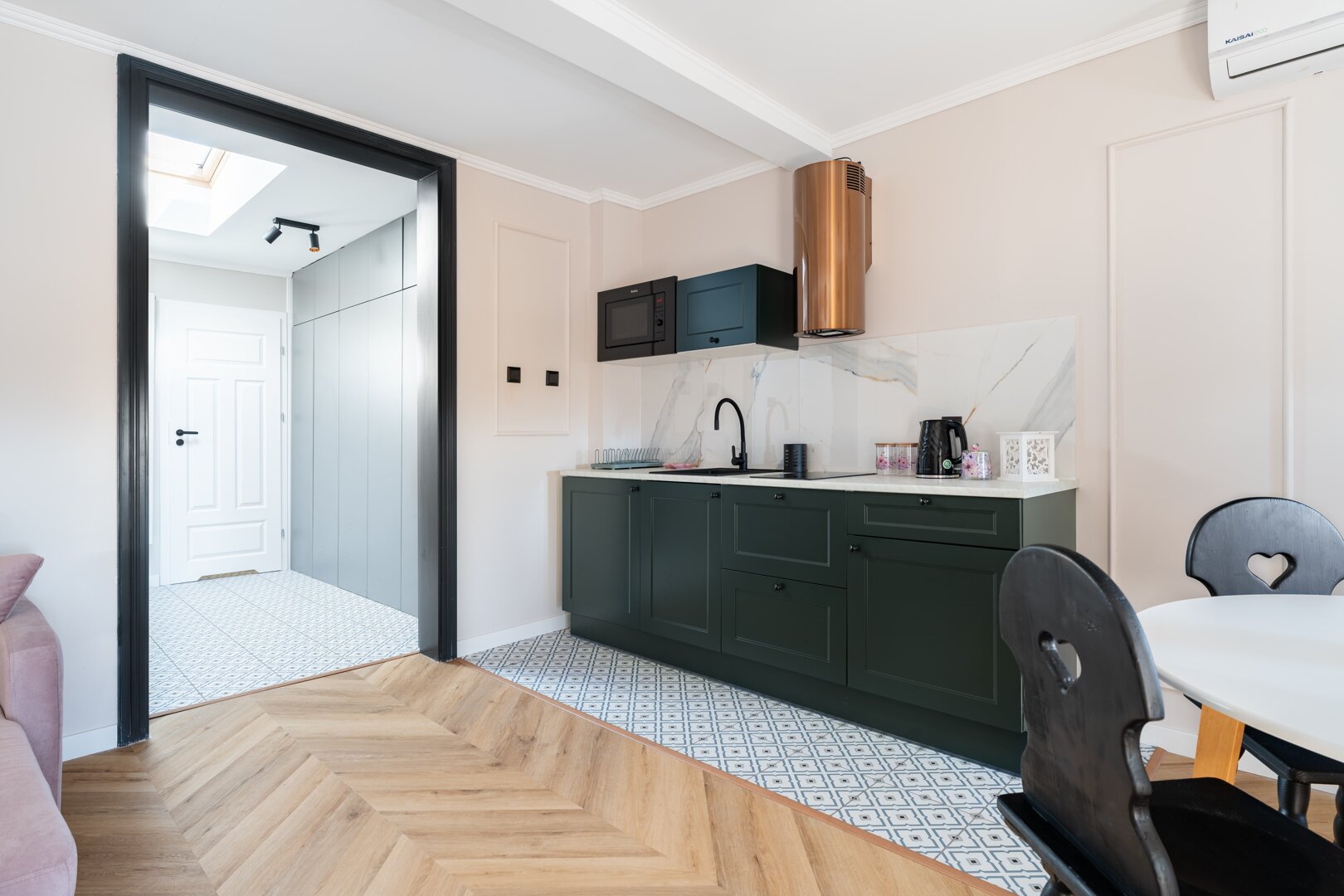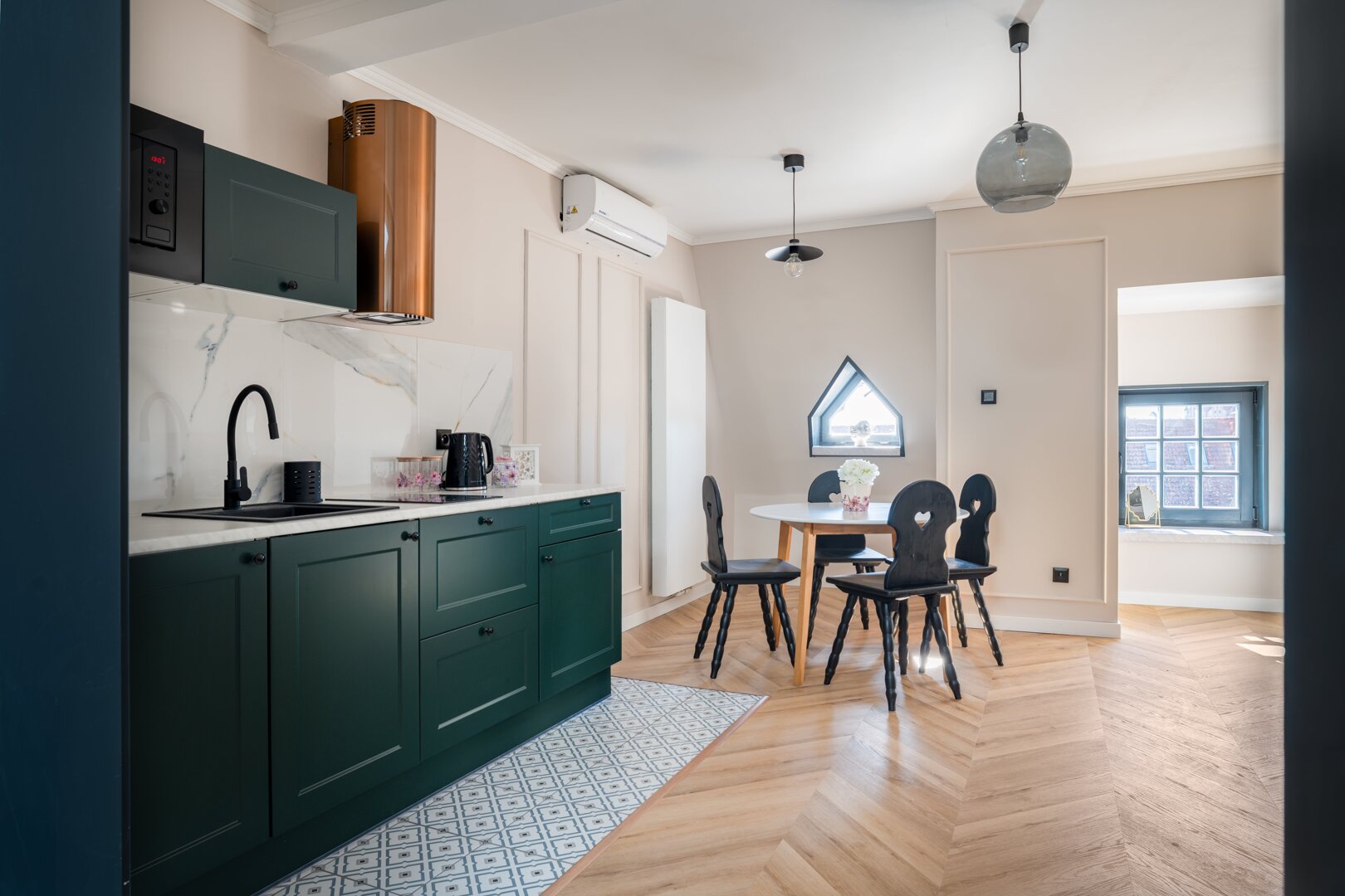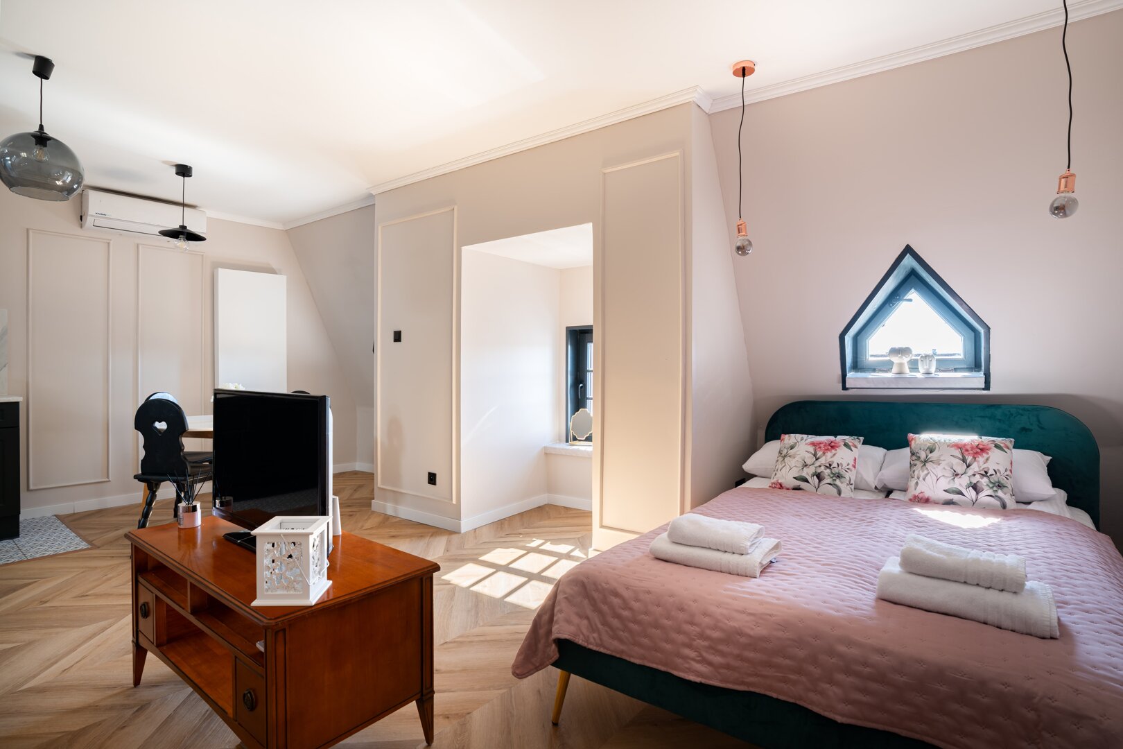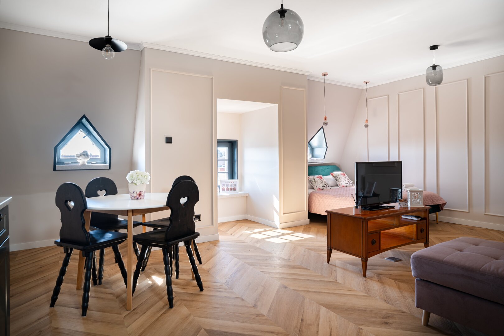 Pod Słońcem is an air-conditioned, self-contained apartment in Toruń, located on Rynek Nowomiejski 24/9, directly next to the historic Old Town Square. The 40 m² apartment accommodates up to 4 people, offering comfortable living space with a lounge area, kitchenette, and bathroom. The interior offers a comfortable standard, fully equipped with everyday amenities and practical amenities for business and leisure guests. Its central location in Toruń allows easy access to major attractions, restaurants, and public transportation. The offer is suitable for both short weekend stays and longer visits to the city. Type and Standard