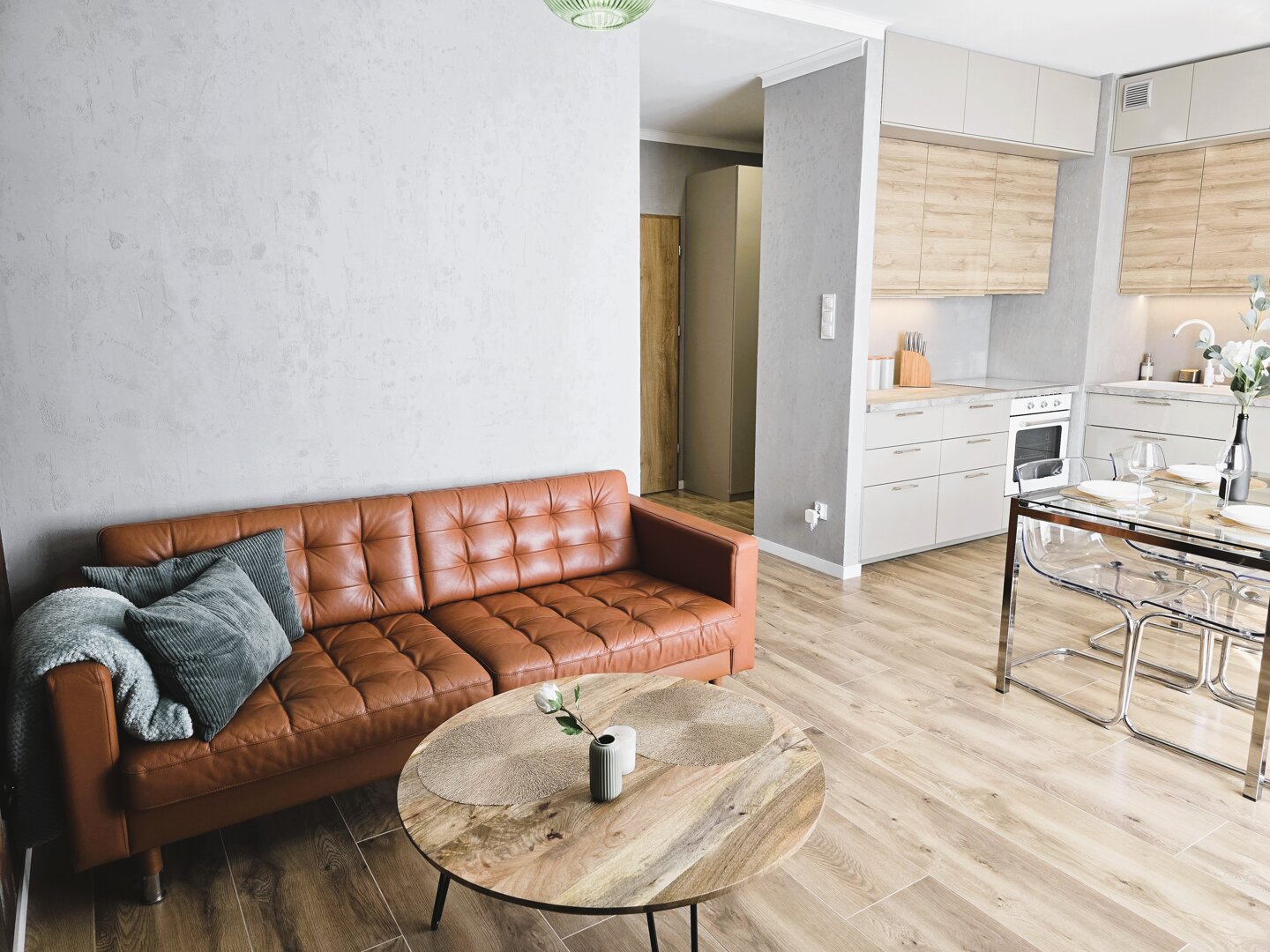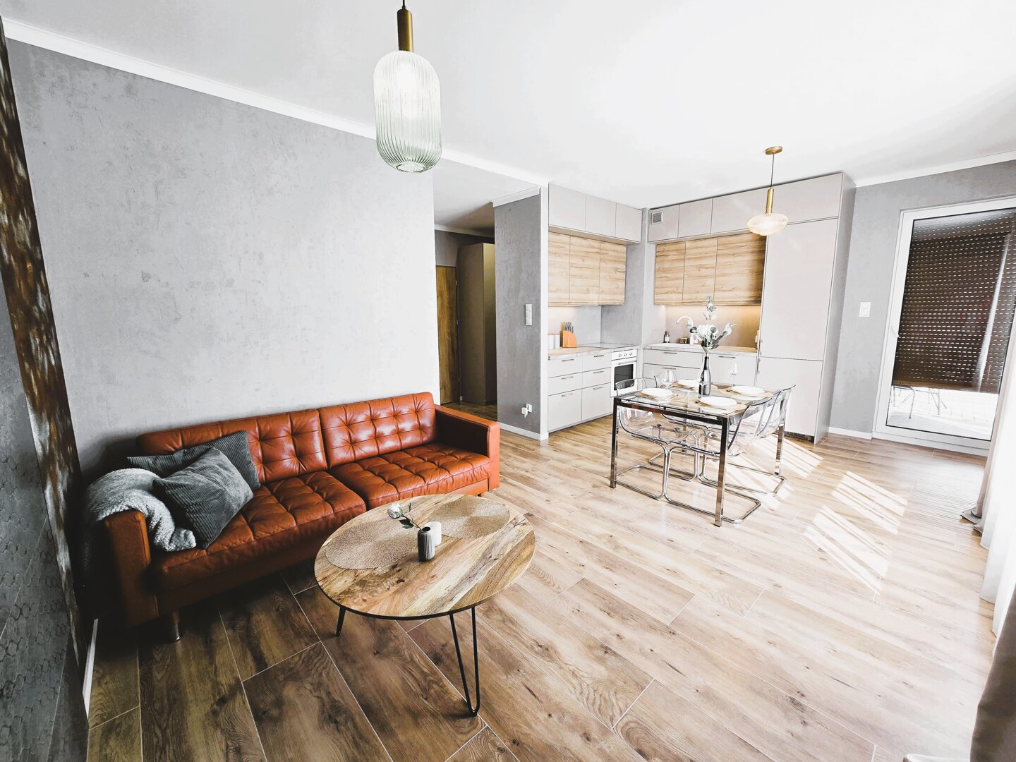 The Zimowy Apartment is a self-contained apartment in Toruń, located on Zimowa Street on the left bank of the Vistula River. The approximately 45 m² apartment accommodates up to 4 people and offers a separate bedroom and a spacious living room with a kitchenette. Its location combines a quiet, green neighborhood with quick access to Toruń's historic center in just a few minutes. The apartment is equipped with a full kitchen, a private bathroom, and on-site parking. The standard and layout of the space meet the typical expectations of both leisure and business guests. Type and Standard