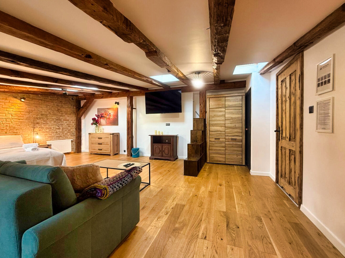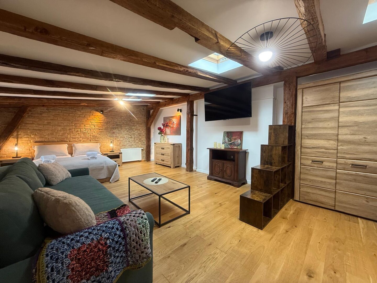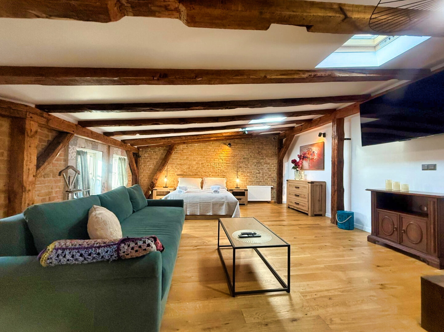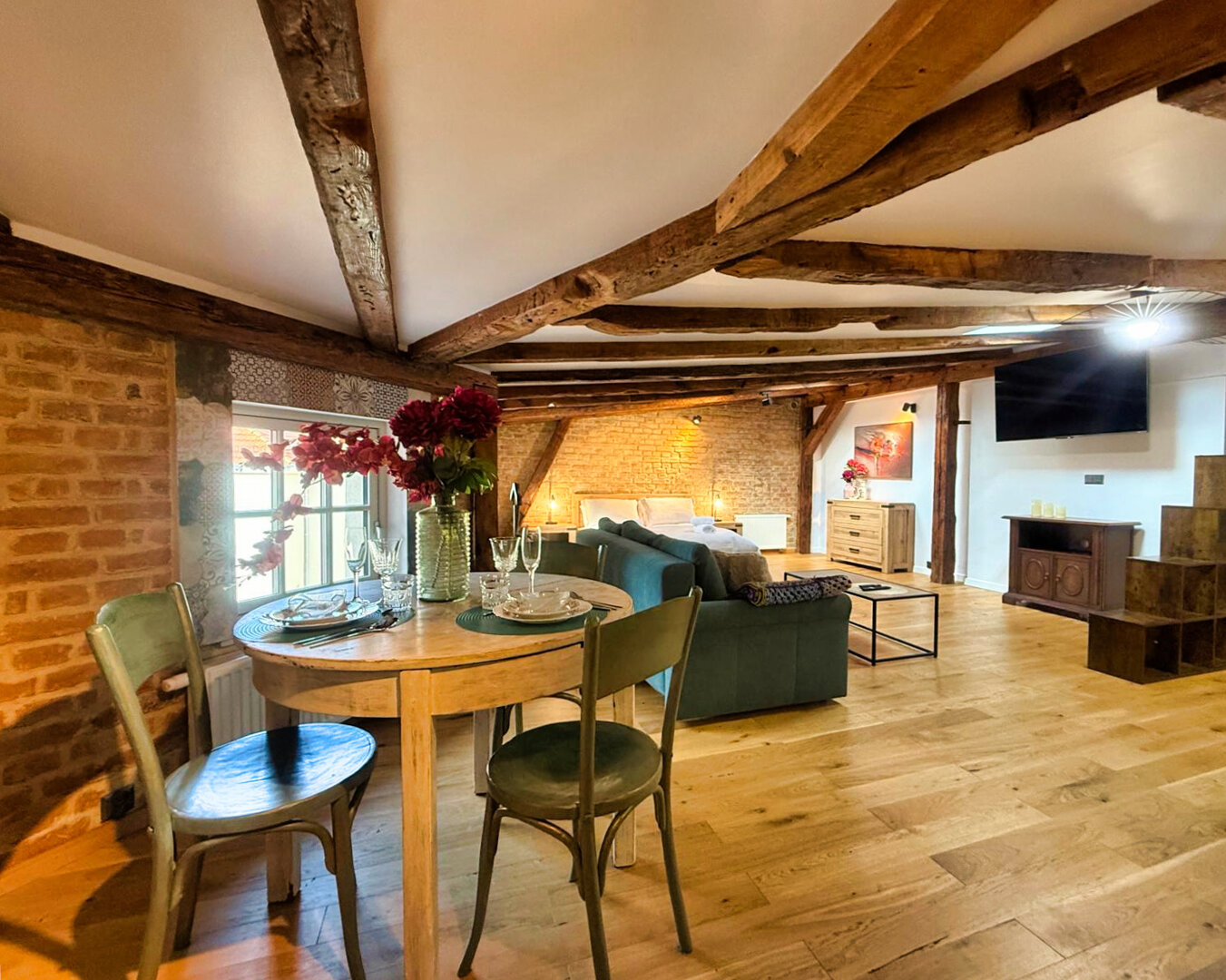 Type and Standard• Self-contained apartment• 50 m², attic of a historic tenement house• Max. 4 people• Central location in Toruń Old Town• No elevator (4th floor)• Private entranceSpace and sleeping• Double bed• Living area with a sofa bed• Storage space• Dining table, lounge areaKitchen• Fully equipped• Refrigerator• Stovetop• Coffee maker• Electric kettle• Kitchenware, microwave