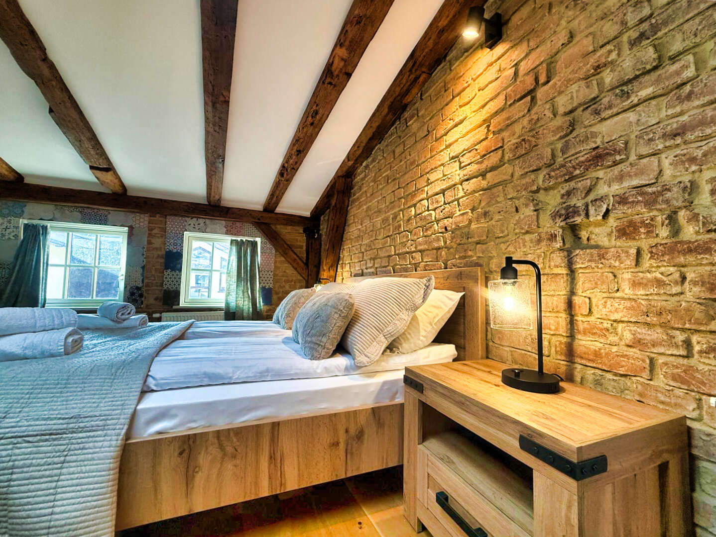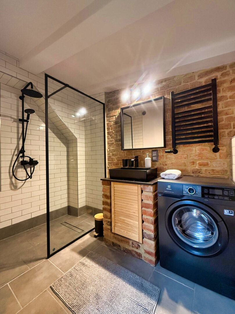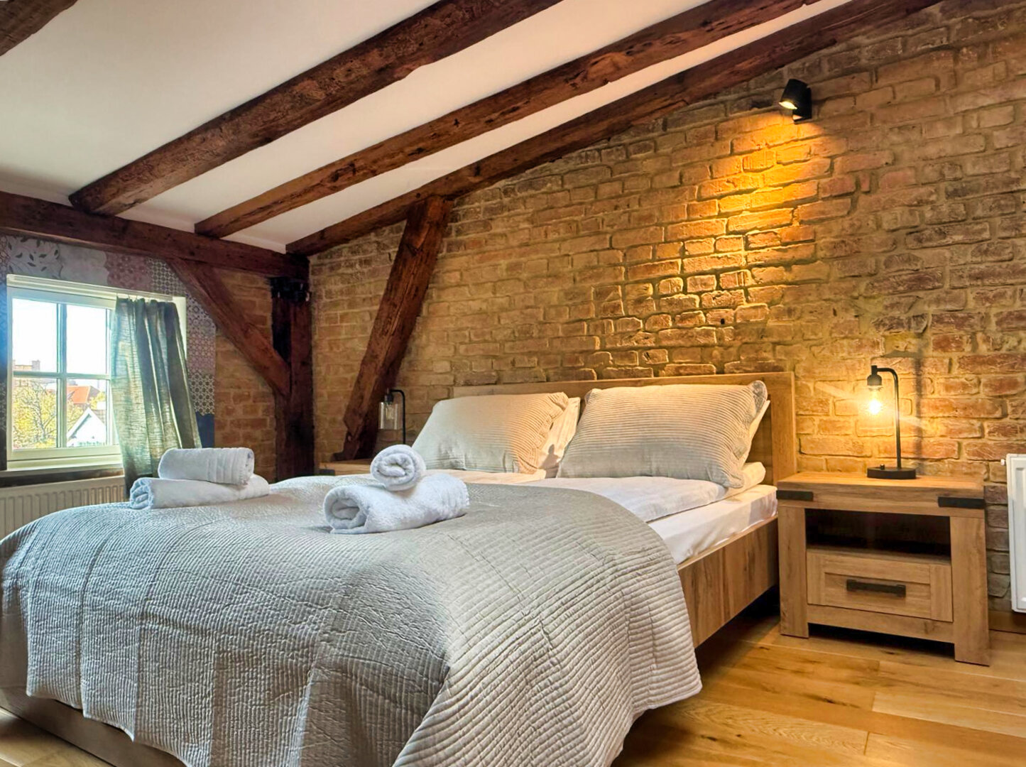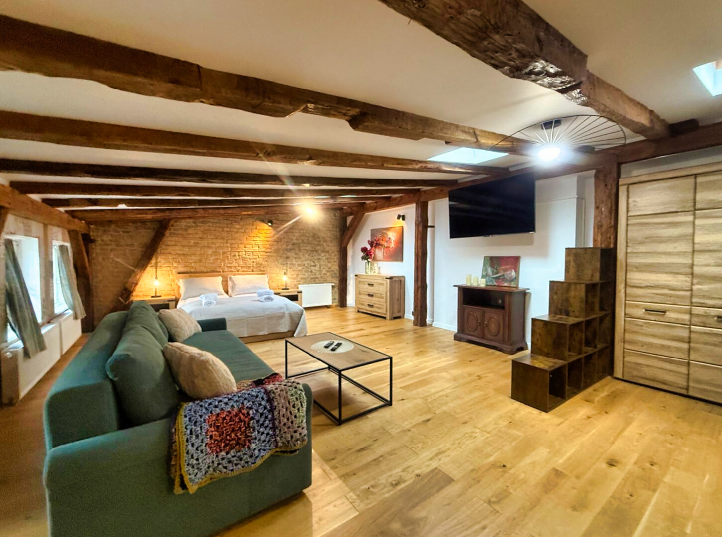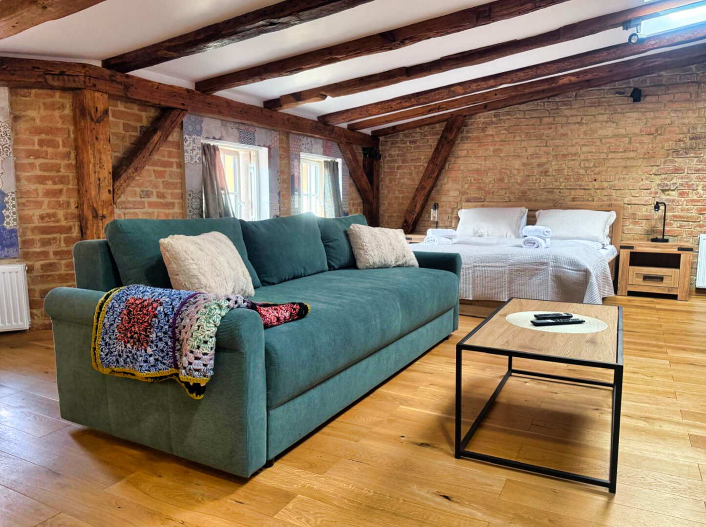 Type and Standard• Self-contained apartment• 50 m², attic of a historic tenement house• Max. 4 people• Central location in Toruń Old Town• No elevator (4th floor)• Private entranceSpace and sleeping• Double bed• Living area with a sofa bed• Storage space• Dining table, lounge areaKitchen• Fully equipped• Refrigerator• Stovetop• Coffee maker• Electric kettle• Kitchenware, microwave
