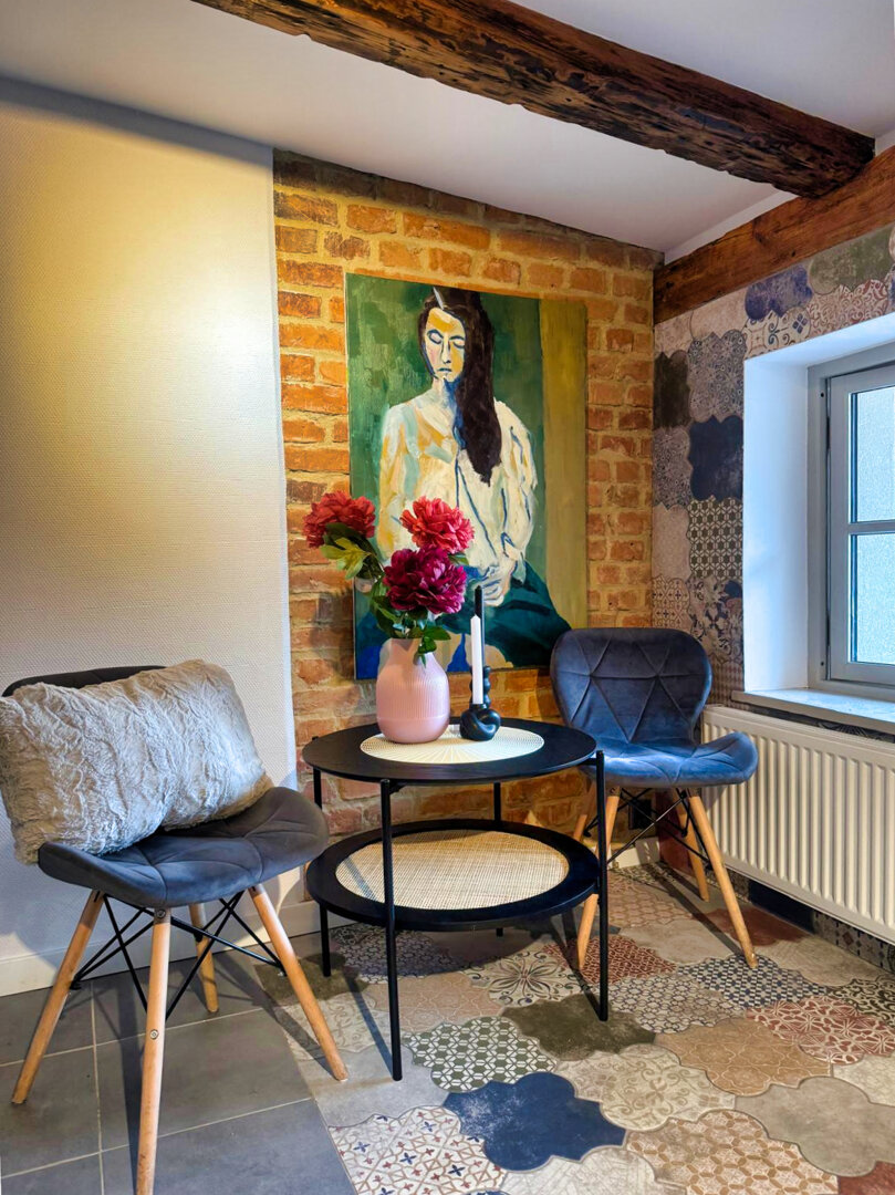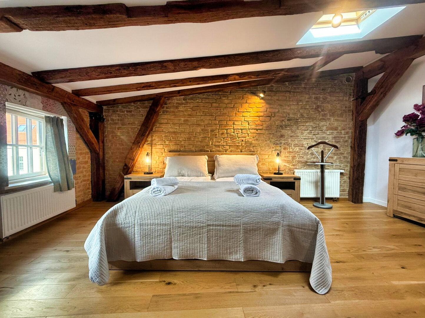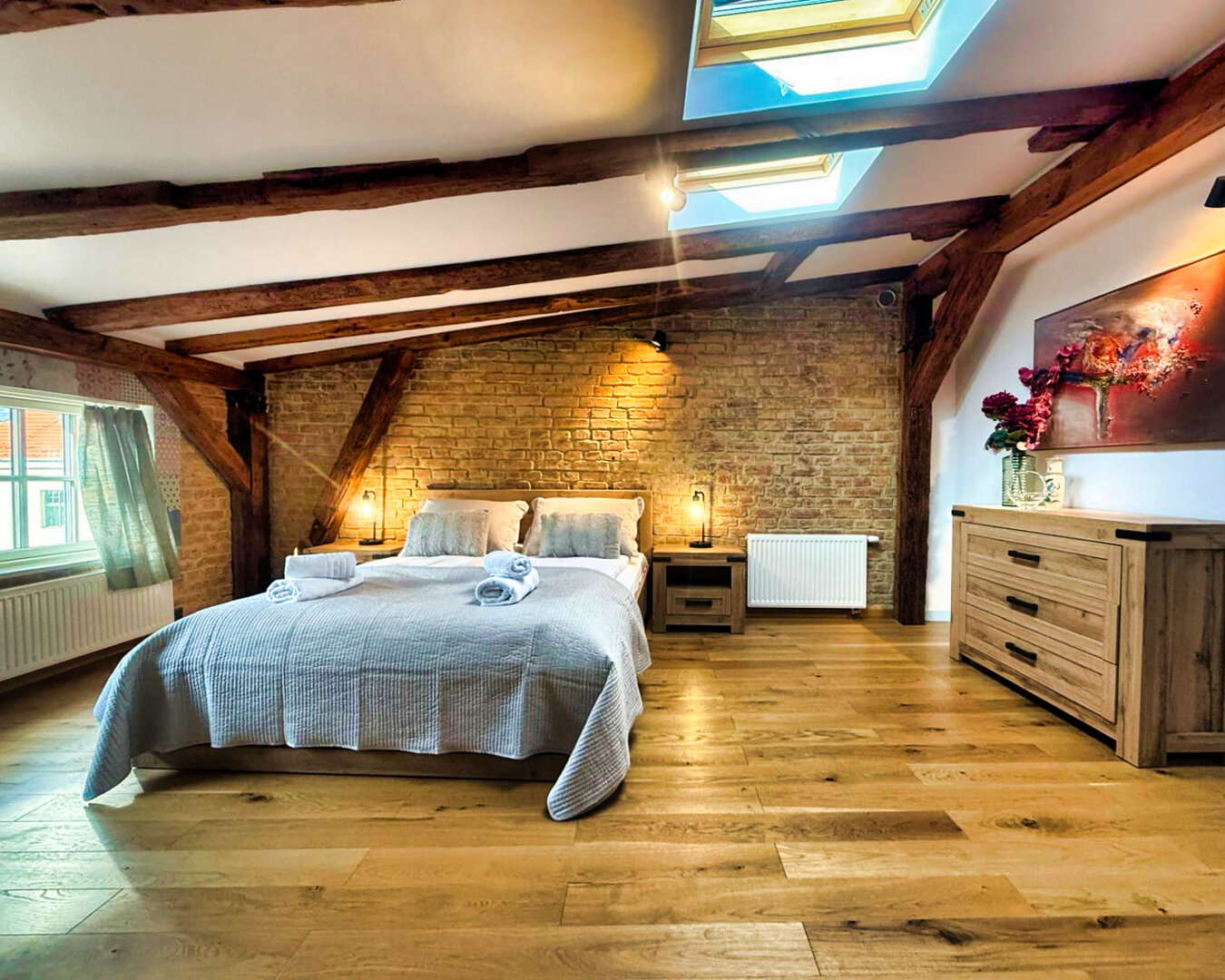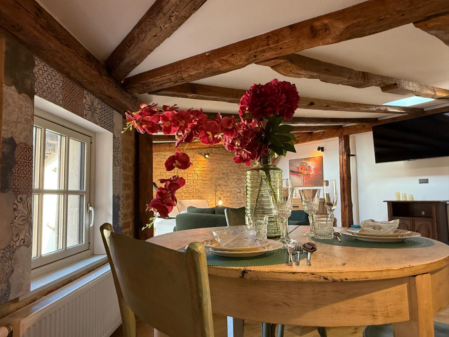 Type and Standard• Self-contained apartment• 50 m², attic of a historic tenement house• Max. 4 people• Central location in Toruń Old Town• No elevator (4th floor)• Private entranceSpace and sleeping• Double bed• Living area with a sofa bed• Storage space• Dining table, lounge areaKitchen• Fully equipped• Refrigerator• Stovetop• Coffee maker• Electric kettle• Kitchenware, microwave